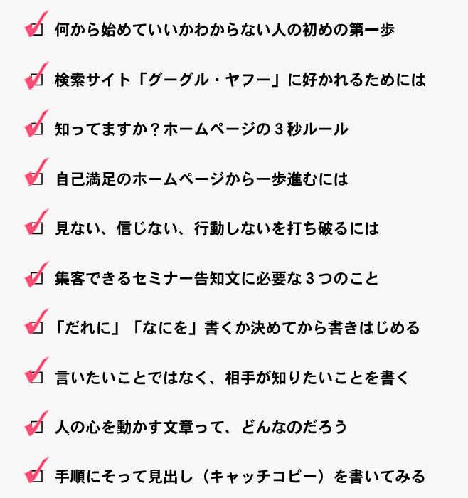 ちょっとした工夫で、集客の反応率が変わってきます。今回は講座の企画から、今一番力のあるホームページからの集客まで具体的なことをおはなしします。